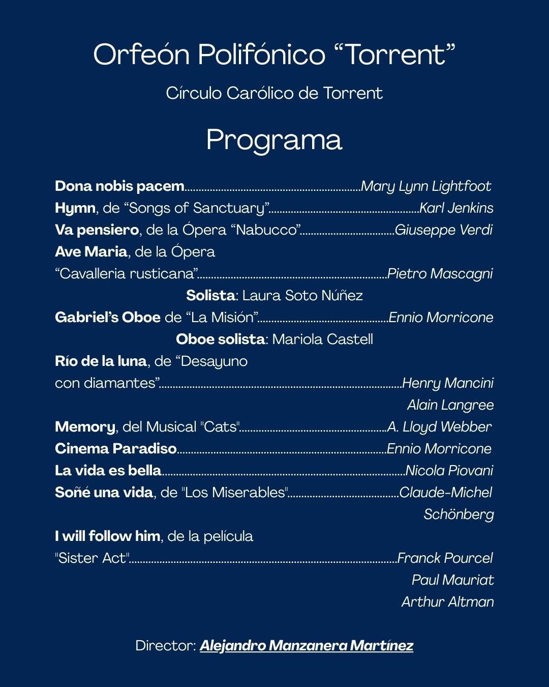 - Solistas destacadas: Contaremos con la participación de la solista Laura Soto Núñez en el «Ave Maria» de Mascagni y de Mariola Castell como oboe solista en el emotivo «Gabriel’s Oboe» de Ennio Morricone.